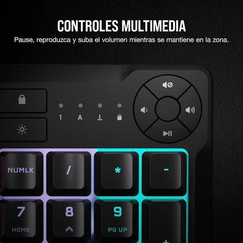El teclado gaming CORSAIR K55 CORE ofrece retroiluminación RGB de 10 zonas personalizable, teclas de membrana silenciosas y rápidas, y resistencia a salpicaduras, brindando comodidad y funcionalidad para alcanzar la victoria en cada partida.